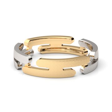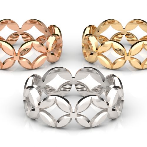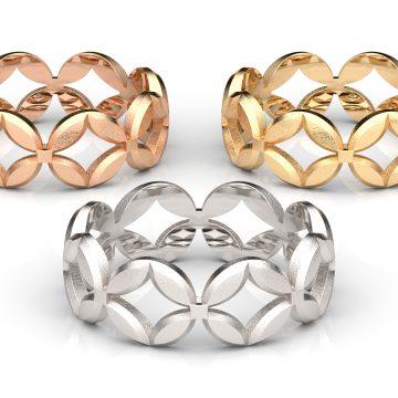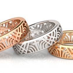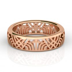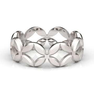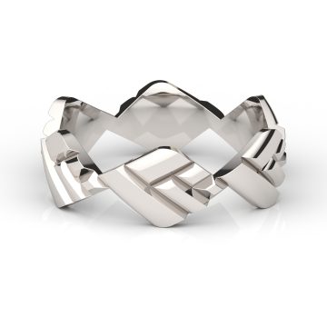 指輪の一方の縁は七角形ですが、もう一方の縁は円、その間をリズミカルな模様が繋ぐ、シャープながら凝った...