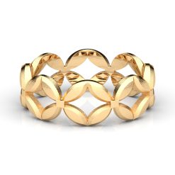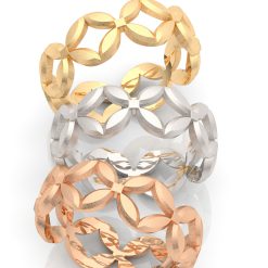 この指輪は、4つの円の重なりとすき間部分を残した透かし模様でブルーオーシャンを表しています。円の重なりが繰り返されており、クロス部分と円部分のどちらに注目するかで印象が異なります。1つの見方に囚われず、他の可能性を探る柔軟さを大切にしたいというメッセージを込めています。